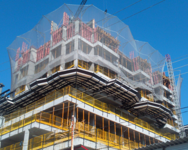 Esse sistema acompanha a subida da estrutura da torre, envolvendo todo o perímetro dos últimos três pavimento.